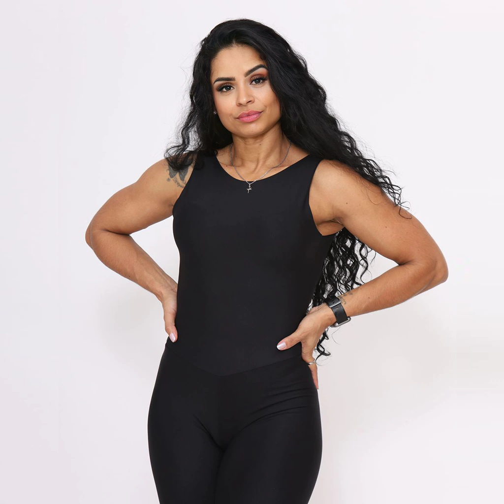 Confeccionado com 89% Poliamida e 11% Elastano, o Macacão Thalita oferece elasticidade, conforto e durabilidade, ajustando-se perfeitamente ao corpo. A modelo veste tamanho M.